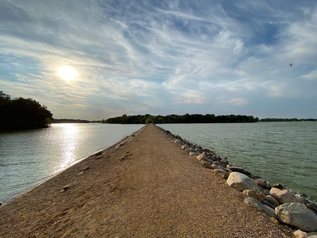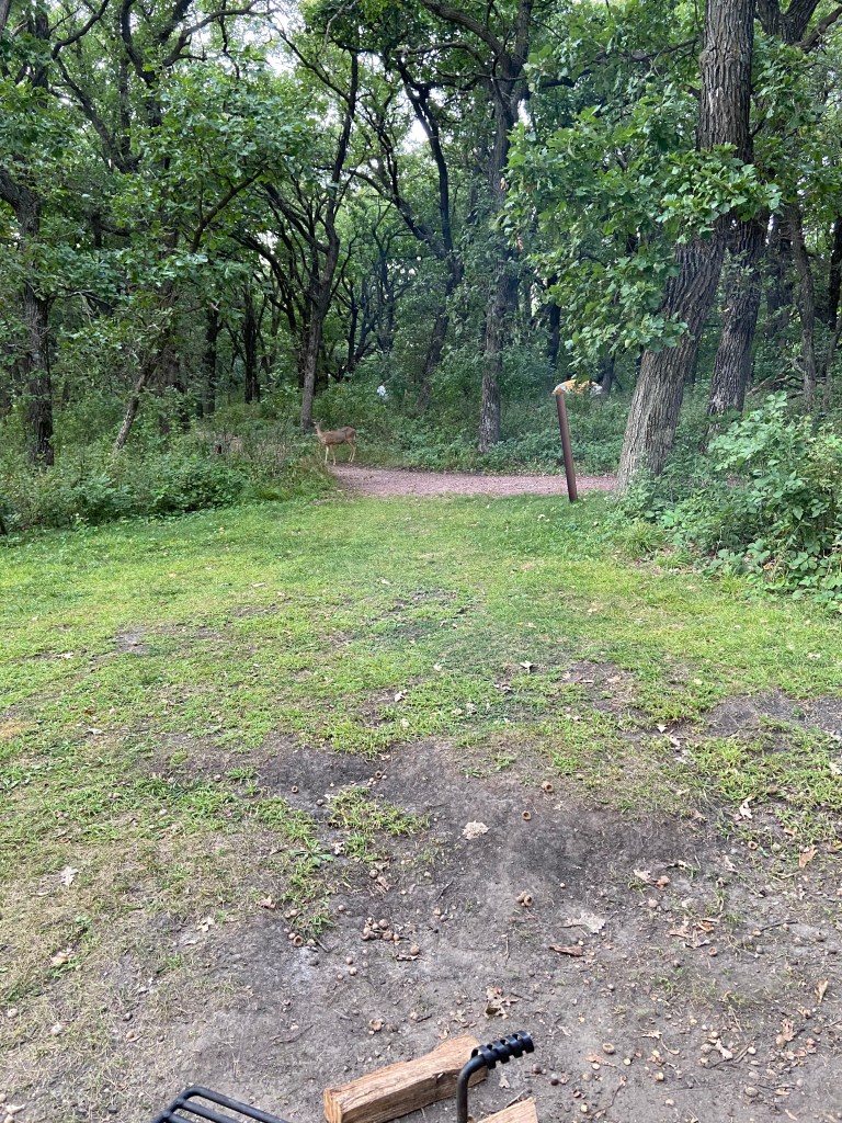 Once we were cooled and dried off, we took a stroll around the campground. Like many State Parks we’ve visited, it is the site of significant historical Dakota vs Settler confrontation but now it has 14 miles of hiking trials and 70+ campsites. It is a beautiful and well-maintained park. We followed the trail that led across a causeway to Loon Island and saw quite a few white tail deer along the way.