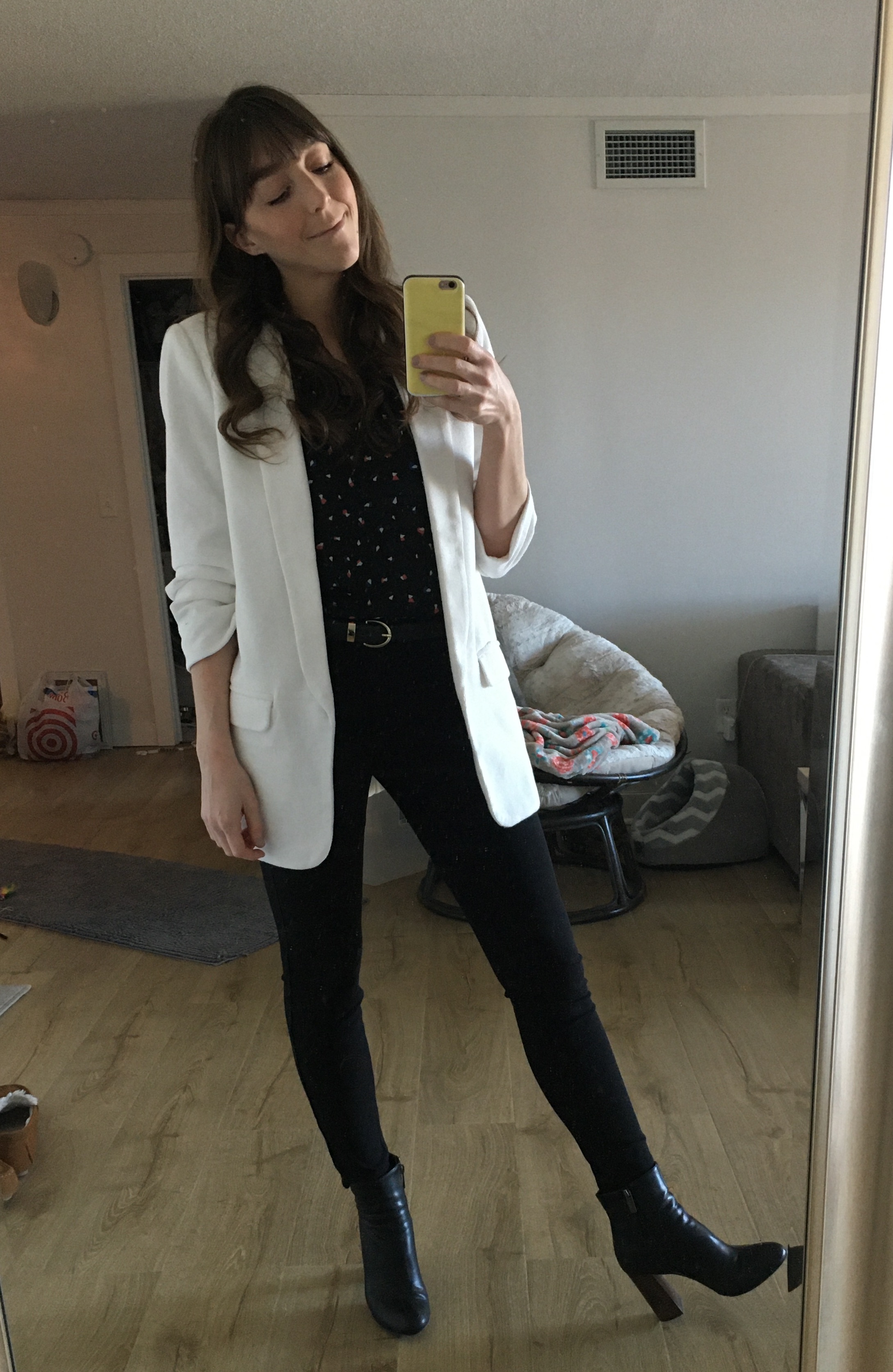 I was extremely fortunate to find employment right before the pandemic hit. As I’m looking at the photos I took of my outfits all I can think is, “Who is this person? I hardly recognize her.” I had long hair with bangs and I actually styled it. Plus, I haven’t worn makeup or real pants in 10 months.