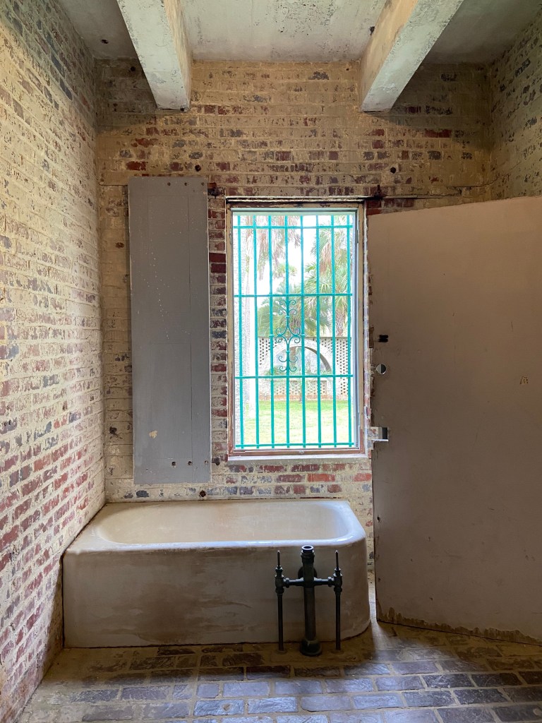 The entire house was heated by coal room heaters and wood-burning fireplaces. One of the more prominent features of the building’s exterior is the grillwork on all of the windows to protect against hurricane force winds.