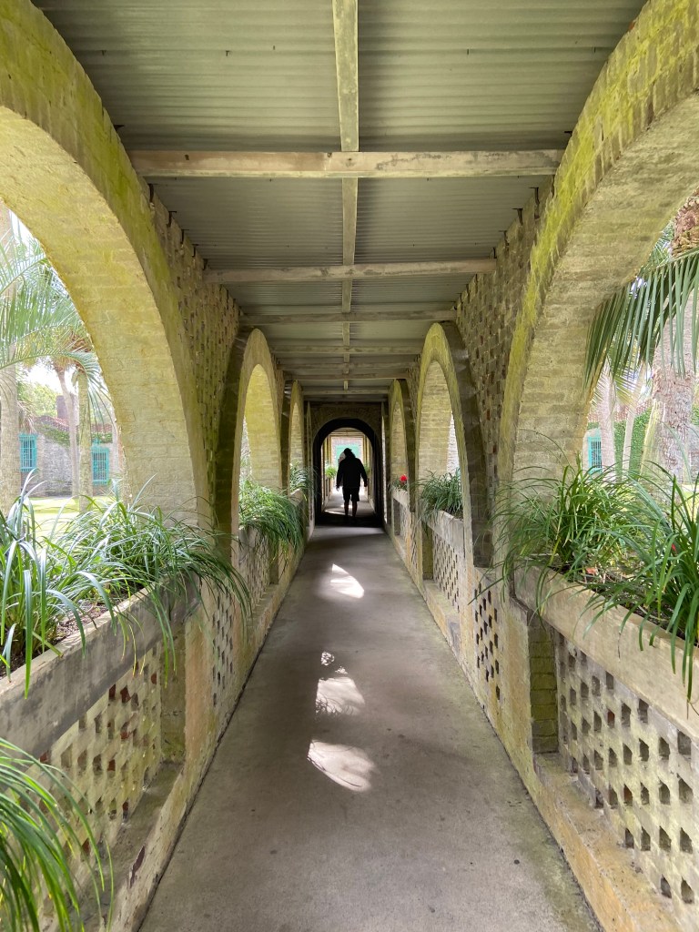 It is a one-story brick building with 30 rooms and two large grassy courtyards. There is a 40-foot tower at the center that contained a 3,000 gallon water tank. The height of the tank gave the water enough pressure to flow through the house.