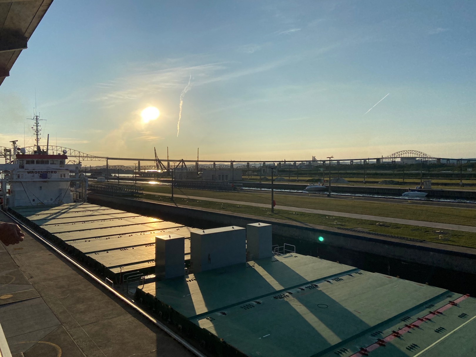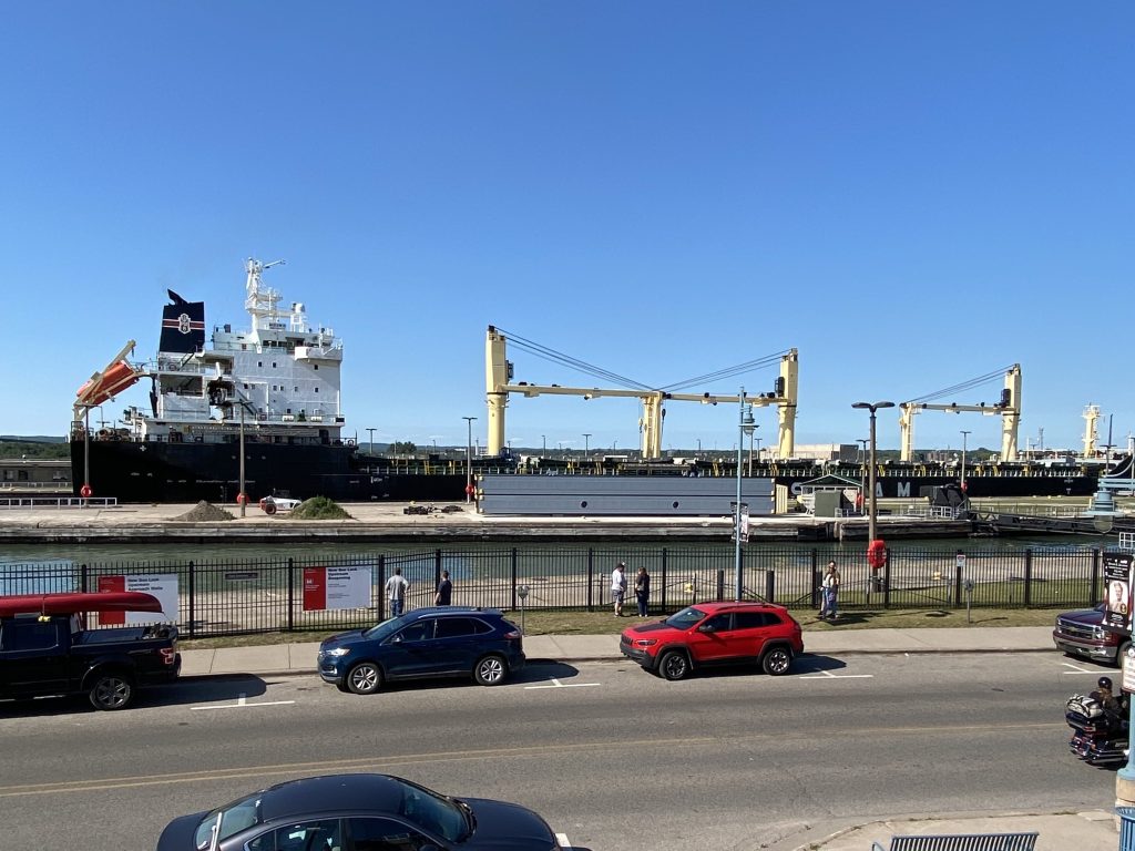 Sault Ste Marie is located on the St Marys River which connects Lake Superior to Lake Huron. The Soo Locks are a man-made lock system built to lower and raise giant freighters over rapids that would otherwise make it impassible. It is the busiest lock system in the entire world with seven to ten thousand ships passing through each year. You can see Canada just across the river and there is a bridge so you can normally cross over the border but it has been closed because of the pandemic.