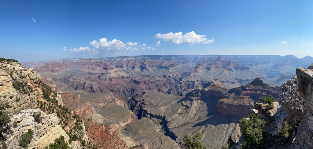 Glenn had never been to the Grand Canyon before (and I hadn’t been since I was in high school) so as we arrived at the south entrance of Grand Canyon National Park we first drove around to a few of the overlooks. It was a holiday weekend so things were pretty crowded (I sound like a broken record! ha!) and they were running shuttles to the west side of the park.