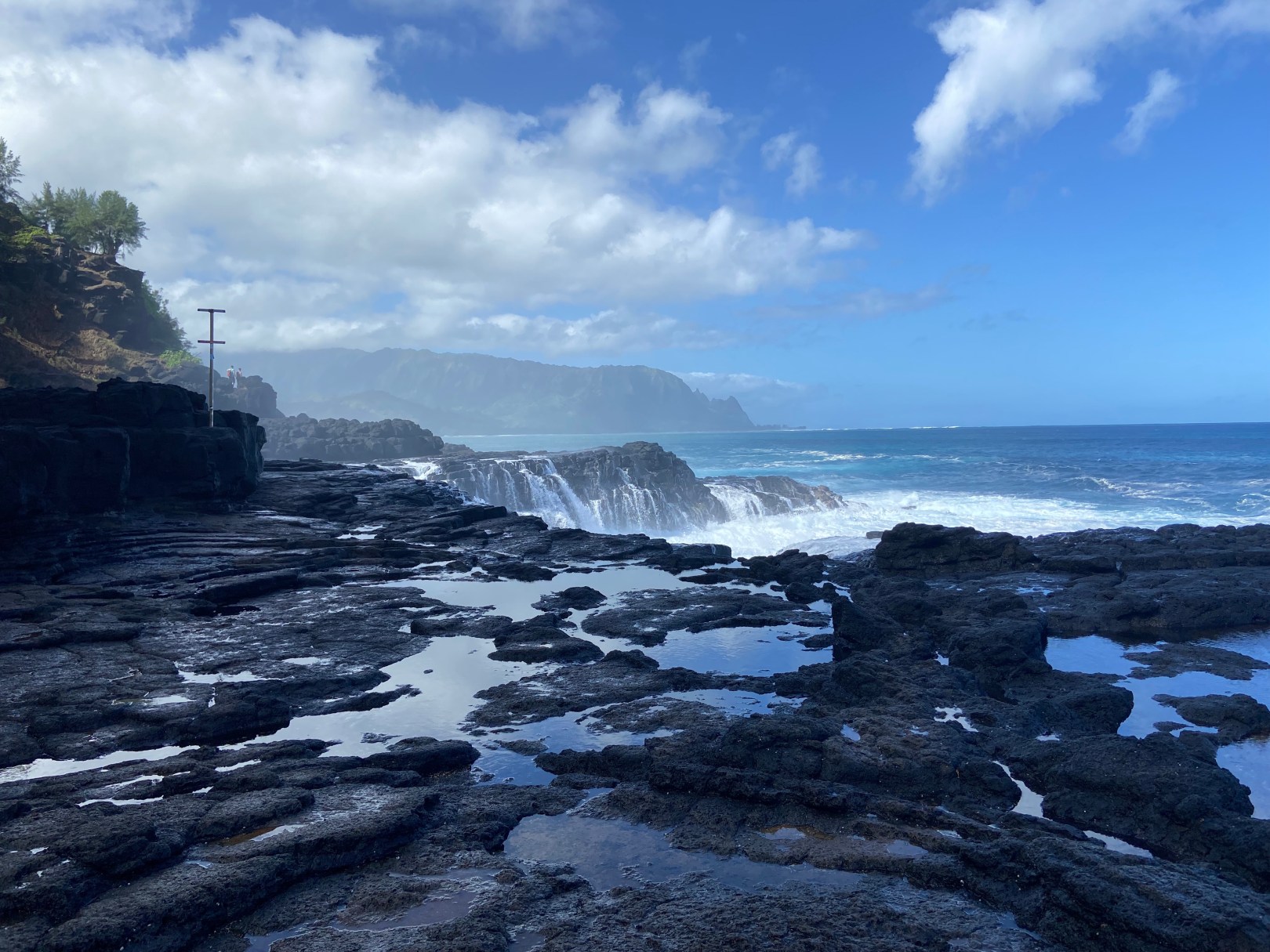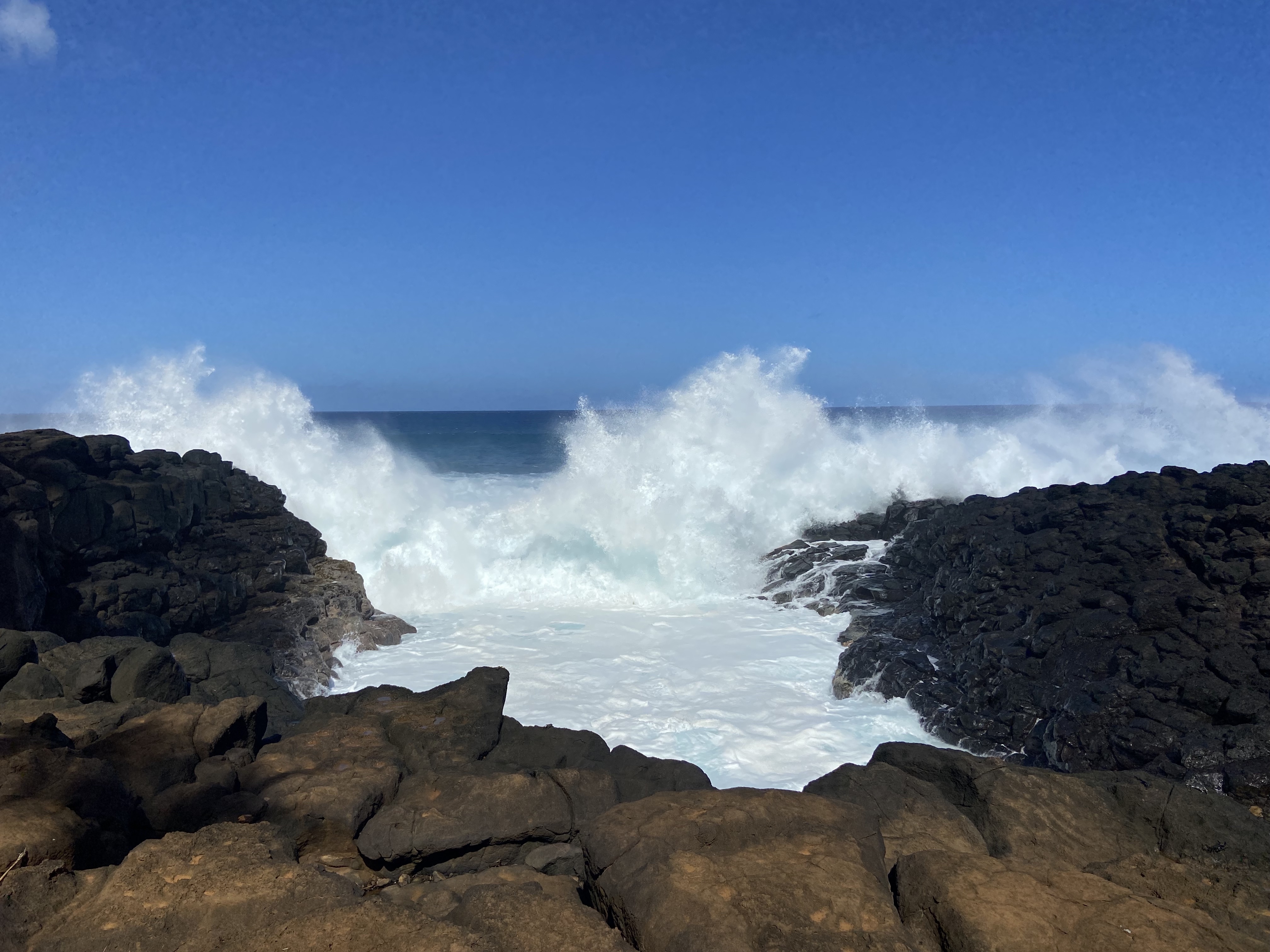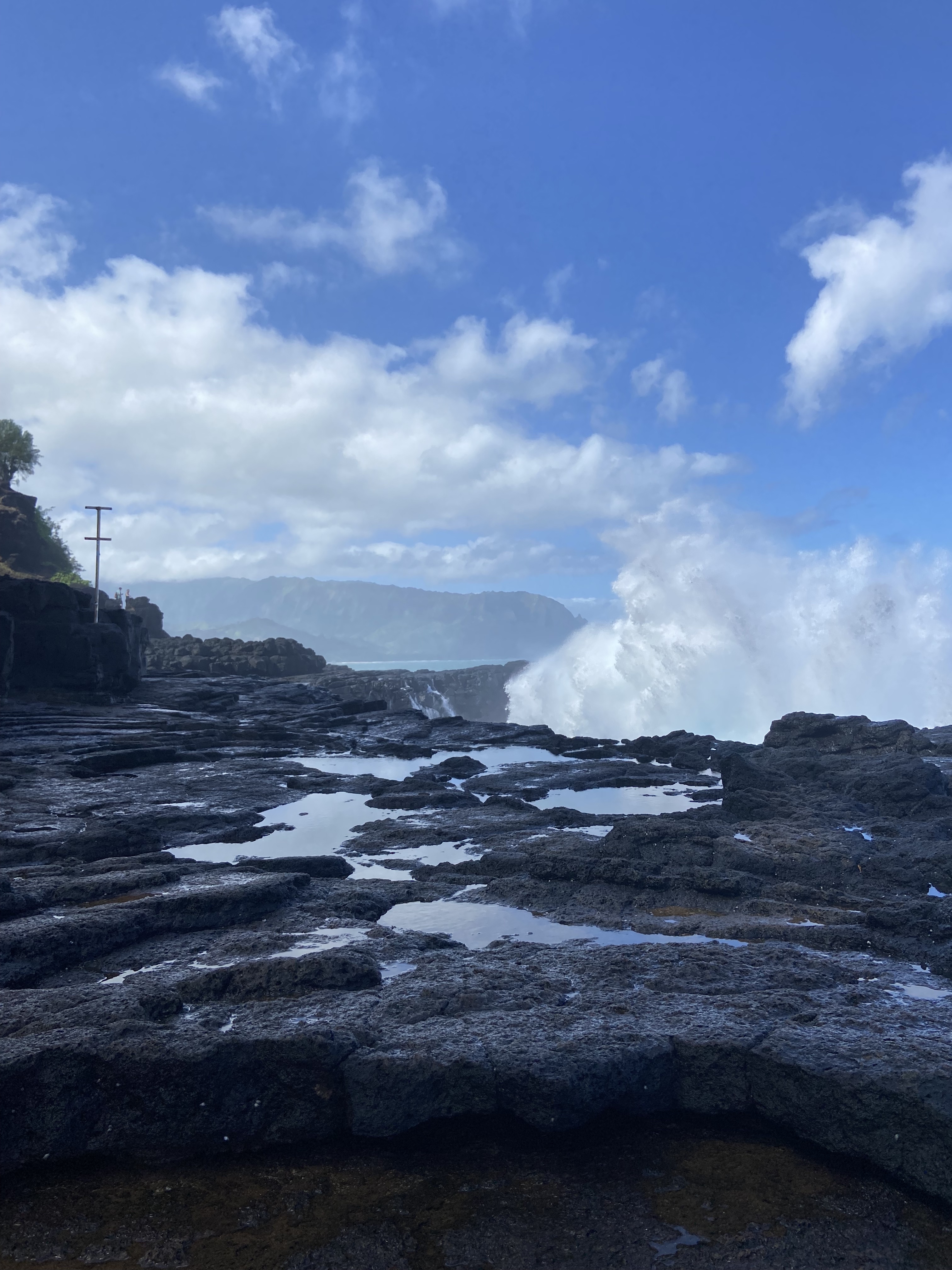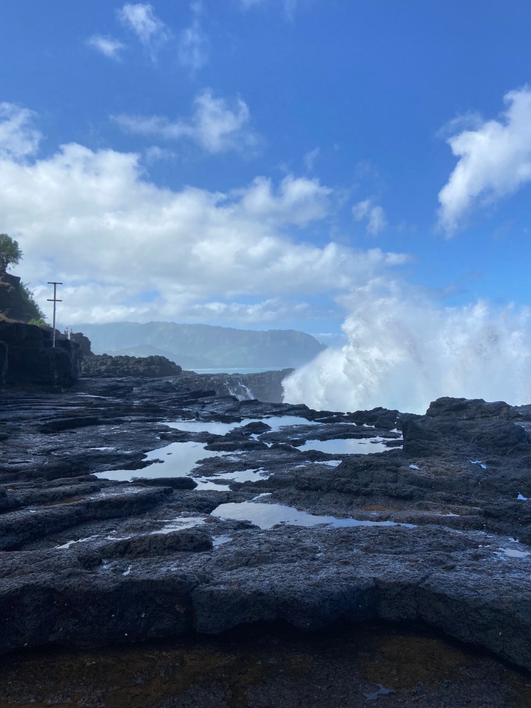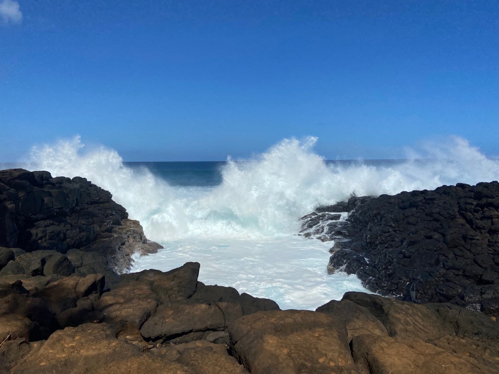 Queen’s Bath is a tide pool located on the north shore of the island of Kauai in Hawaii. There is a small parking lot at the trailhead and it’s a short but steep hike down to the shore. A sign at the base of the trail warns visitors of how dangerous the rocks can be. I read that approximately 30 people have died at Queen’s Bath.