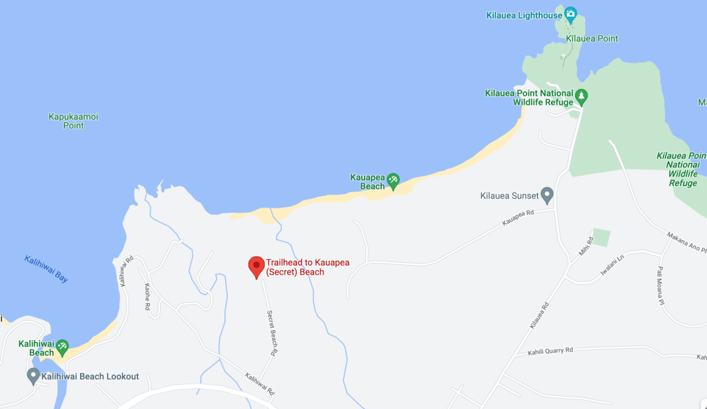 Kauapea Beach or Secret Beach is located on the North Shore of the island of Kauai in Hawaii. There’s a parking lot at the trailhead and it’s a short, steep hike to get down to the beach. I guess it’s not-so-secret when the trailhead is on Google Maps.