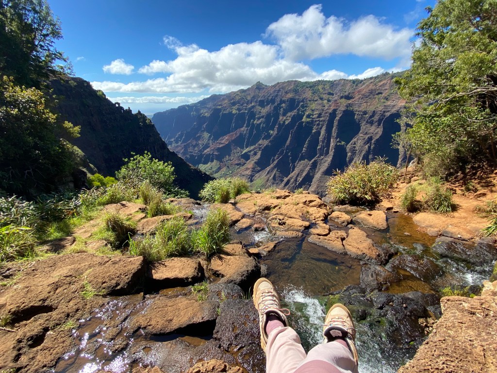 The Waimea Canyon Lookout is also the parking lot for the Canyon Trail to Waipo’o Falls. It’s a 3 mile out and back trail and I would say it is a moderately difficult hike to get to the falls. You have to be super careful as you go down to the falls but it is so worth it.