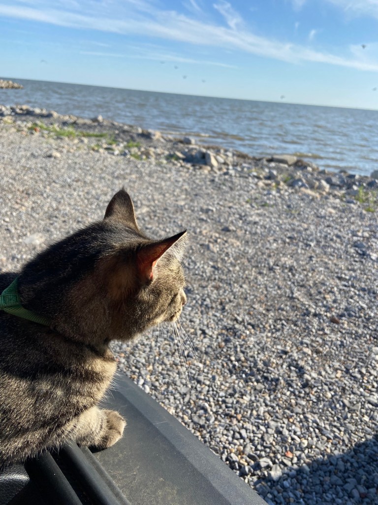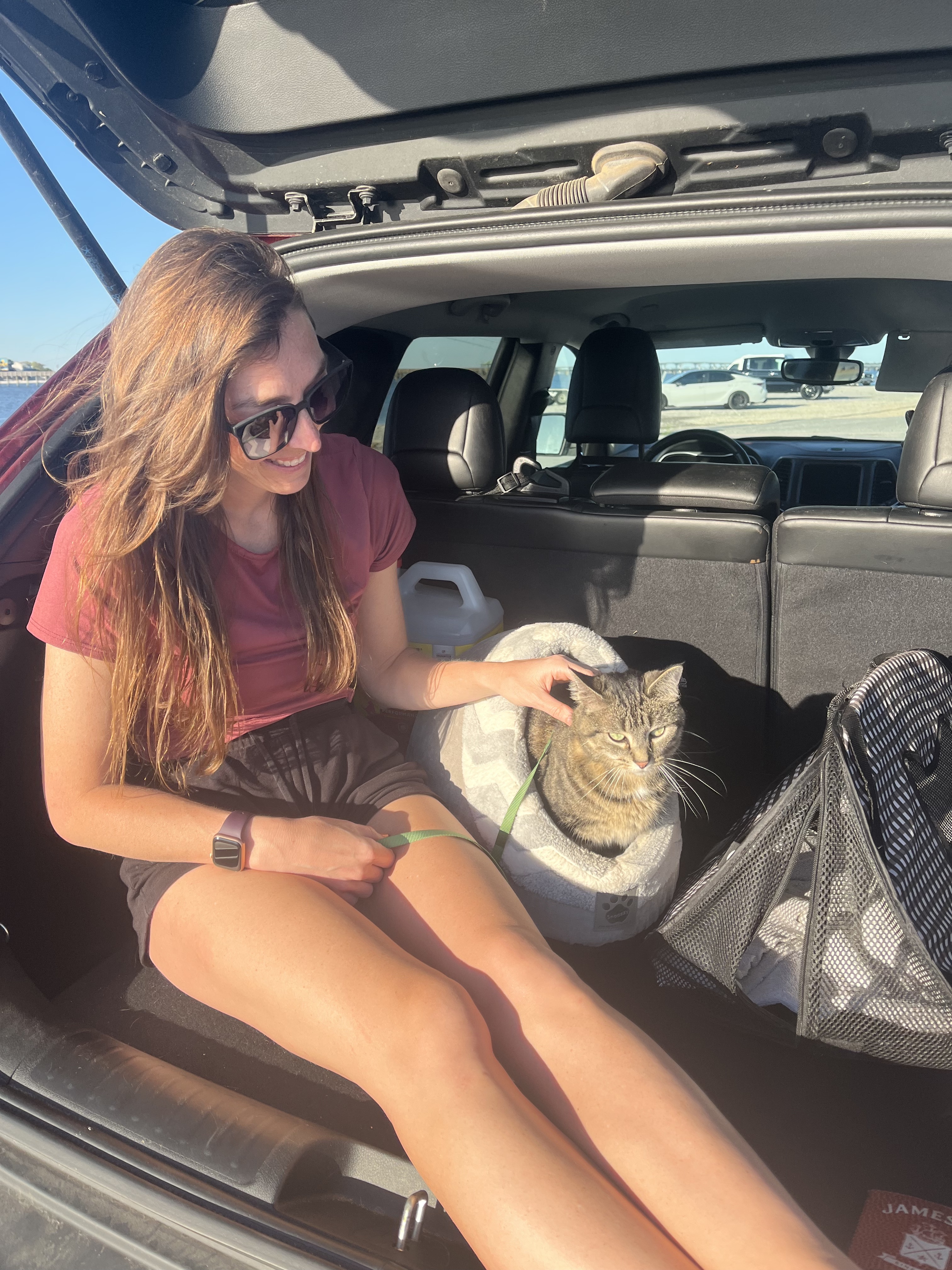 Our Airbnb host needed to stop by for a little while so we decided to get everyone out of the house but taking a trip to the beach. We kept the cat on her harness and in the trunk of the Jeep and I think her mind was blown by all of the seagulls.