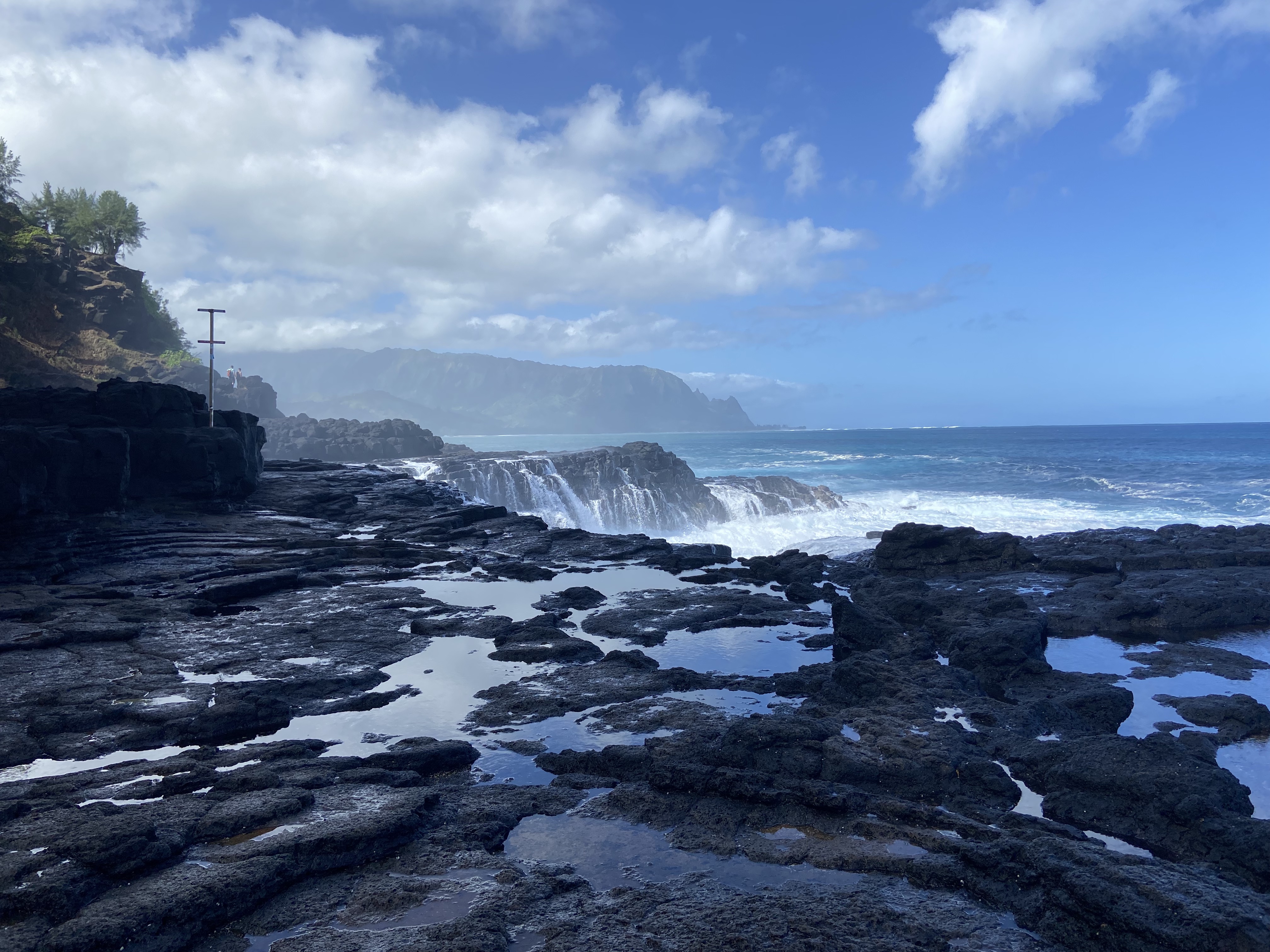 Another natural attraction in Princeville is Queen’s Bath. It’s a tide pool in the rocky shoreline. On calmer days, people wade into the pool but we visited in the winter when the surf tends to be extremely high. We really enjoyed watching the huge waves crash into the rocks. But use caution! Every year, people lose their lives to these waves.