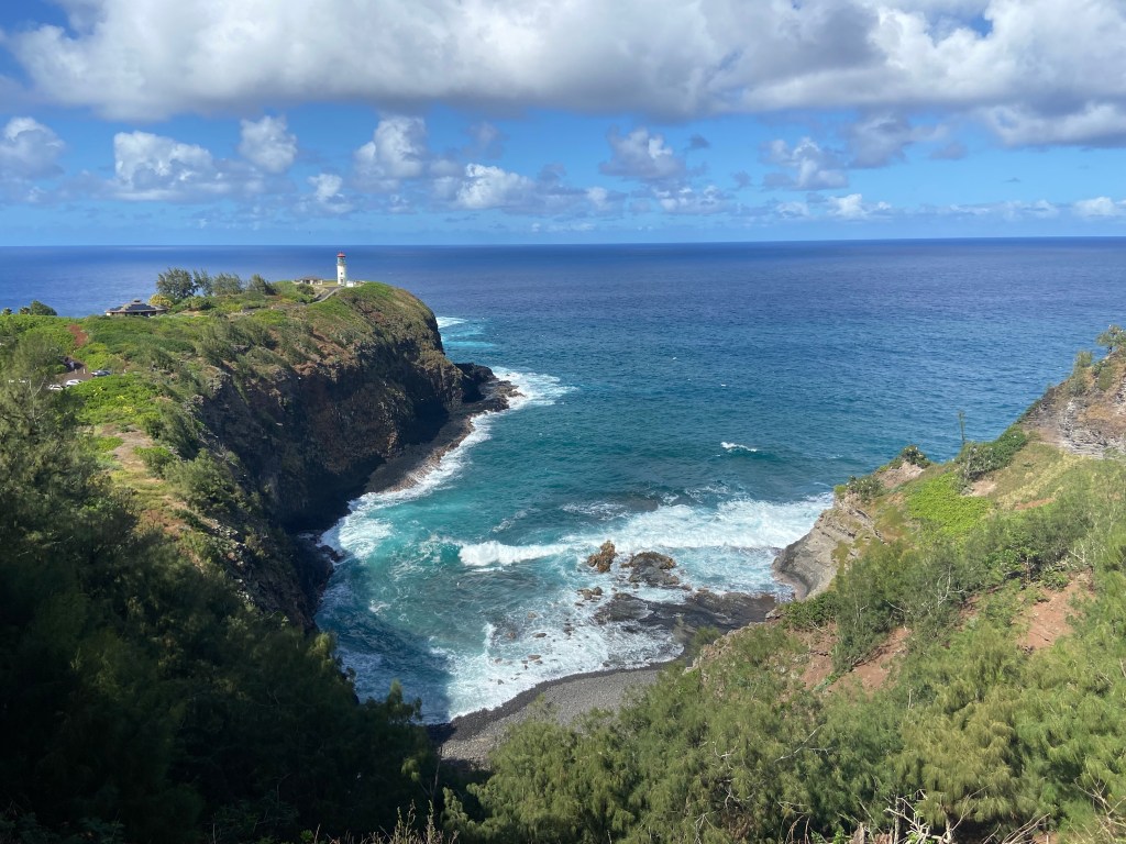 You can see the Kilauea Lighthouse watching over Secret Beach. The lighthouse and surrounding are is also a wildlife refuge. The cliffs and grassy slopes of a dormant volcano provide a breeding ground for many Hawaiian seabirds.