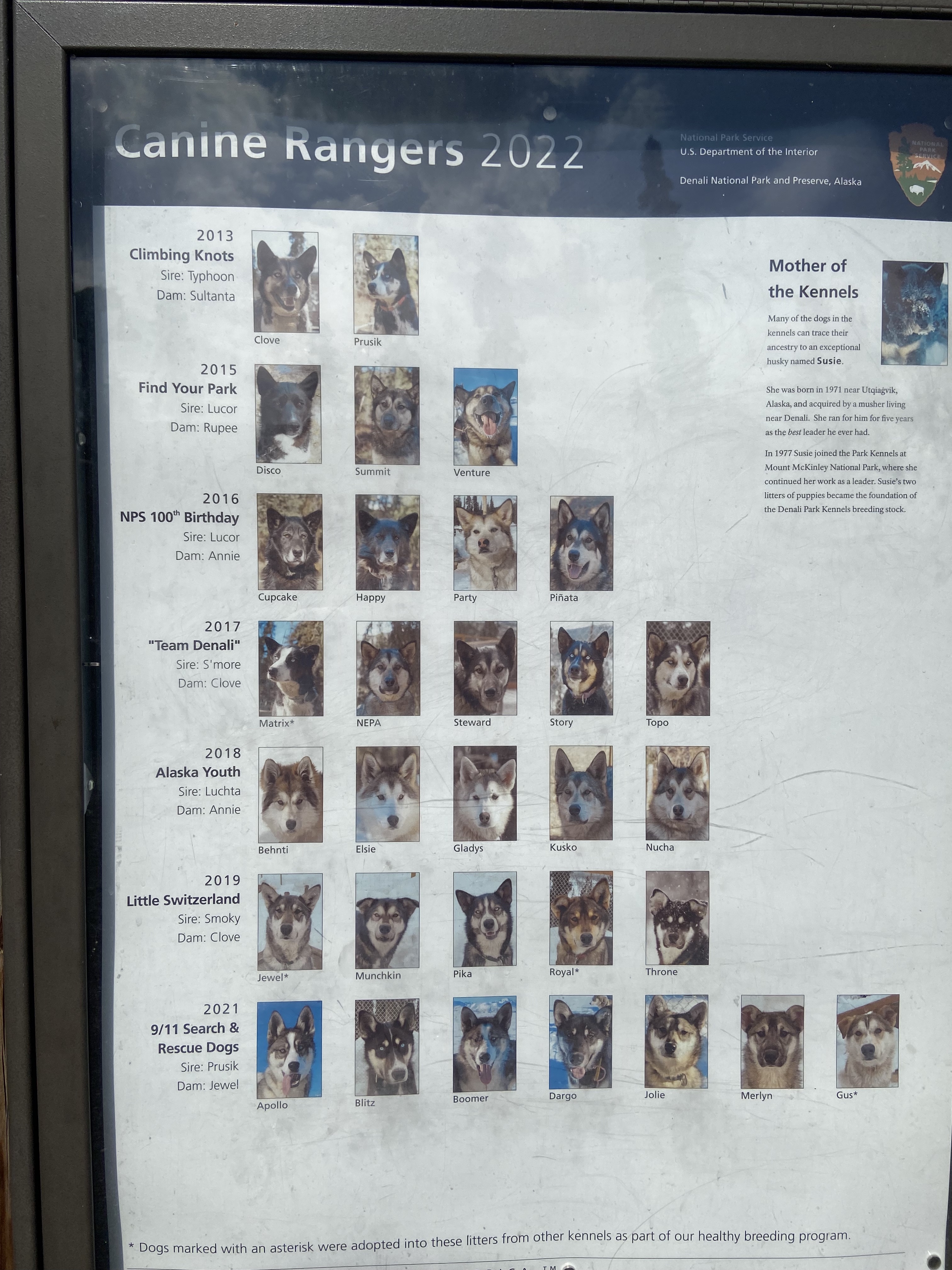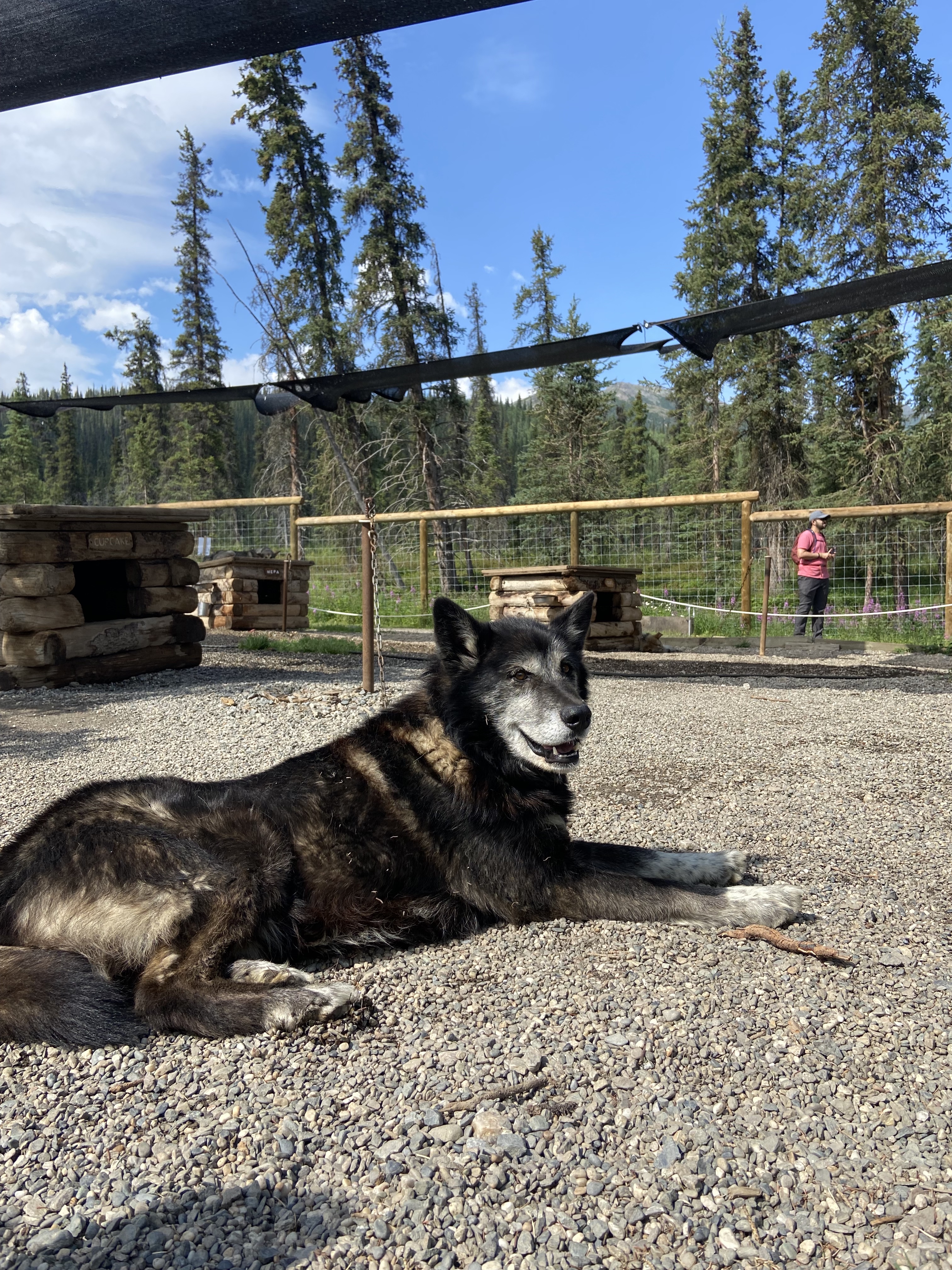 After our Mt Healy hike, we went to the sled dog kennels. There has been a team of sled dogs in Denali since the 1920s and they are used to patrol and maintain the park in the sub-arctic conditions. Most of the dogs are out where you can see and even pet them if they allow it. In the summer months, volunteers take them on walks and runs to keep them in shape for winter when they get to run for miles and miles in the snow.