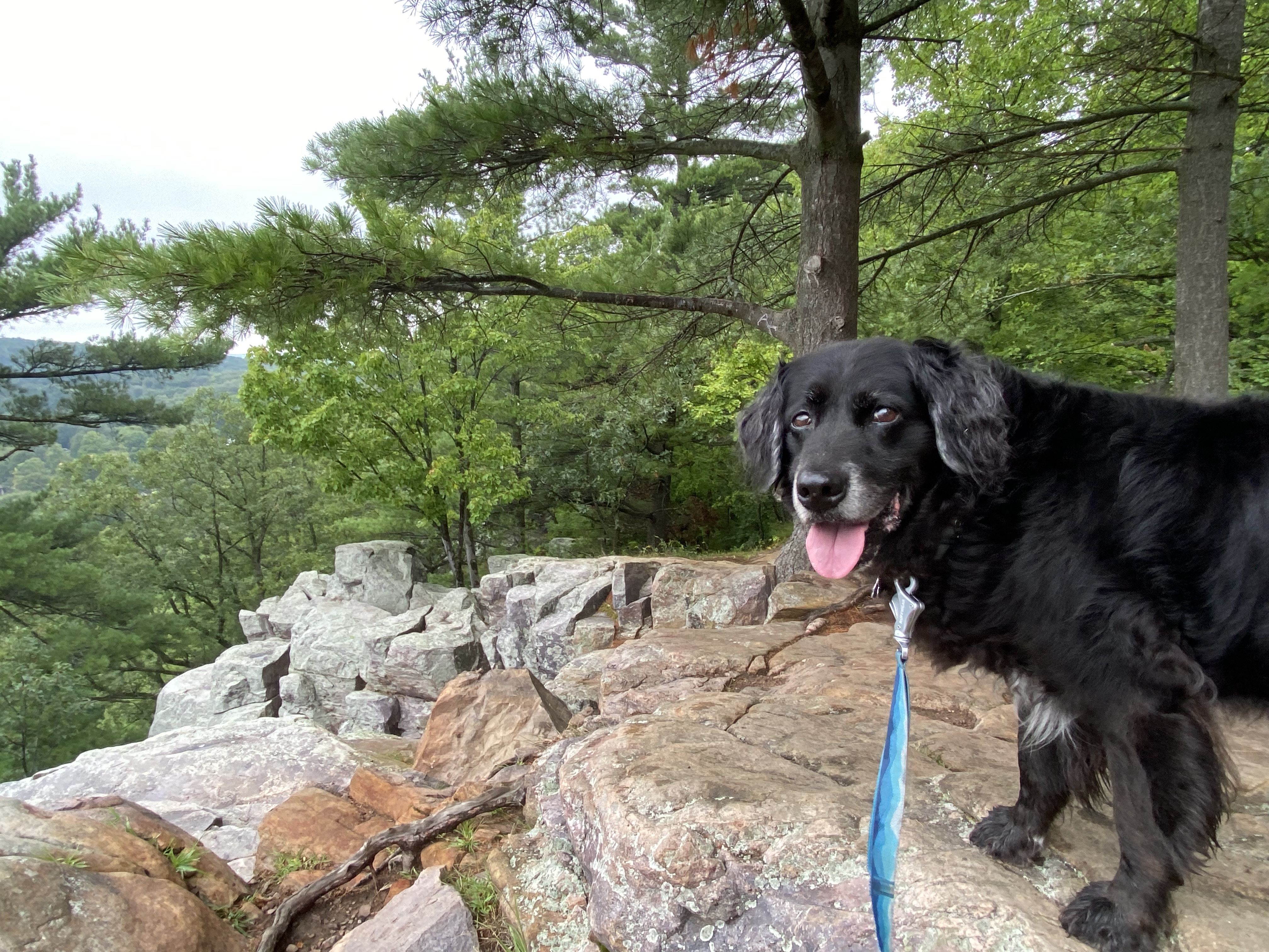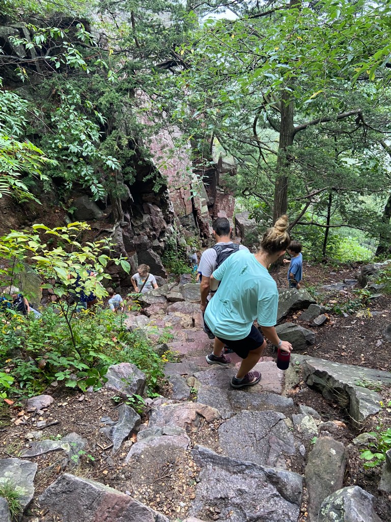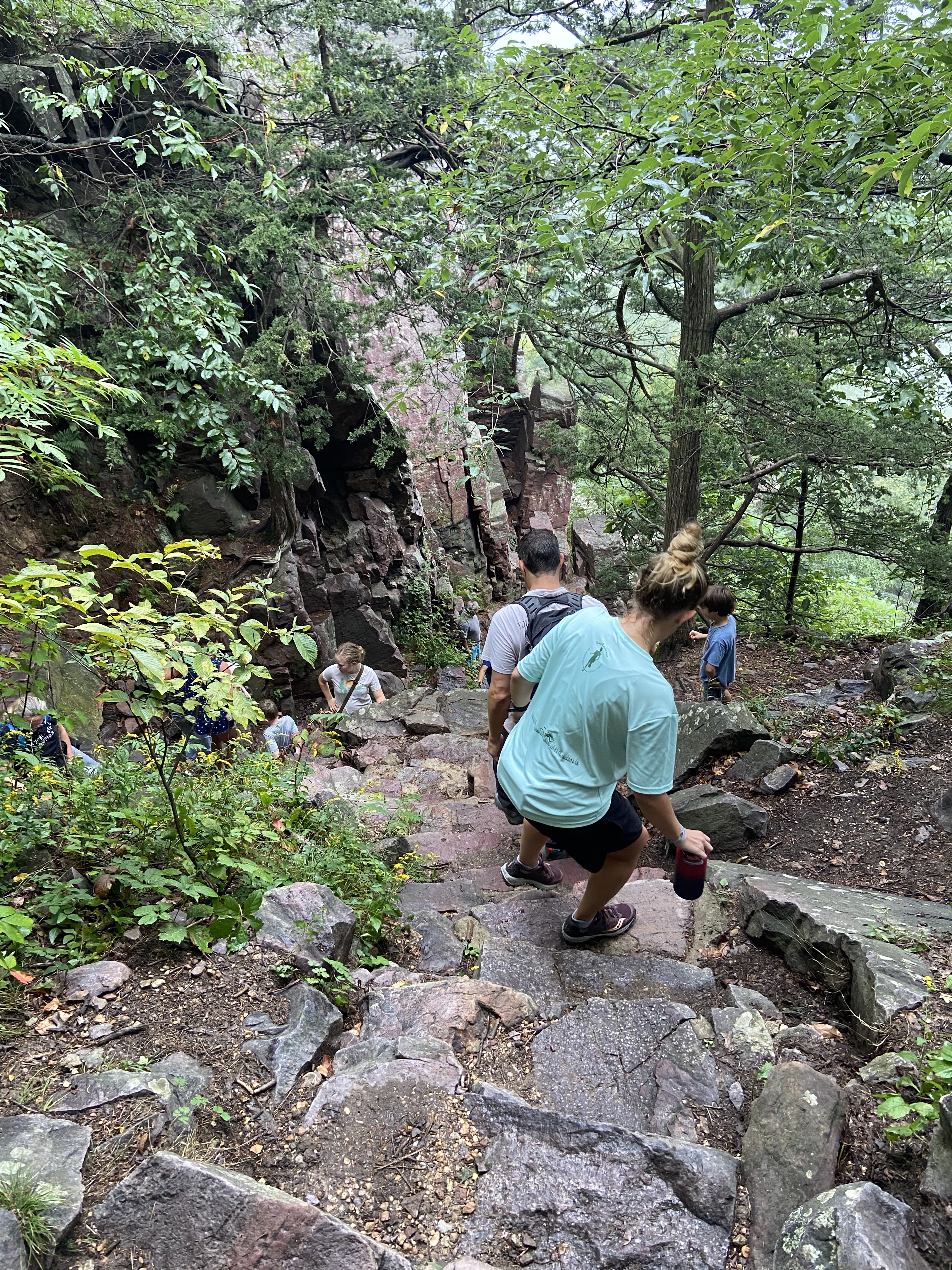Another thing we learned is that none of the trails are rated for difficulty and they’re really steep in some spots. We found ourselves on the 0.3 mile Pothole trail that is 500 ft straight down on rocky steps. The dog probably had the easiest time thanks to her four legs.
