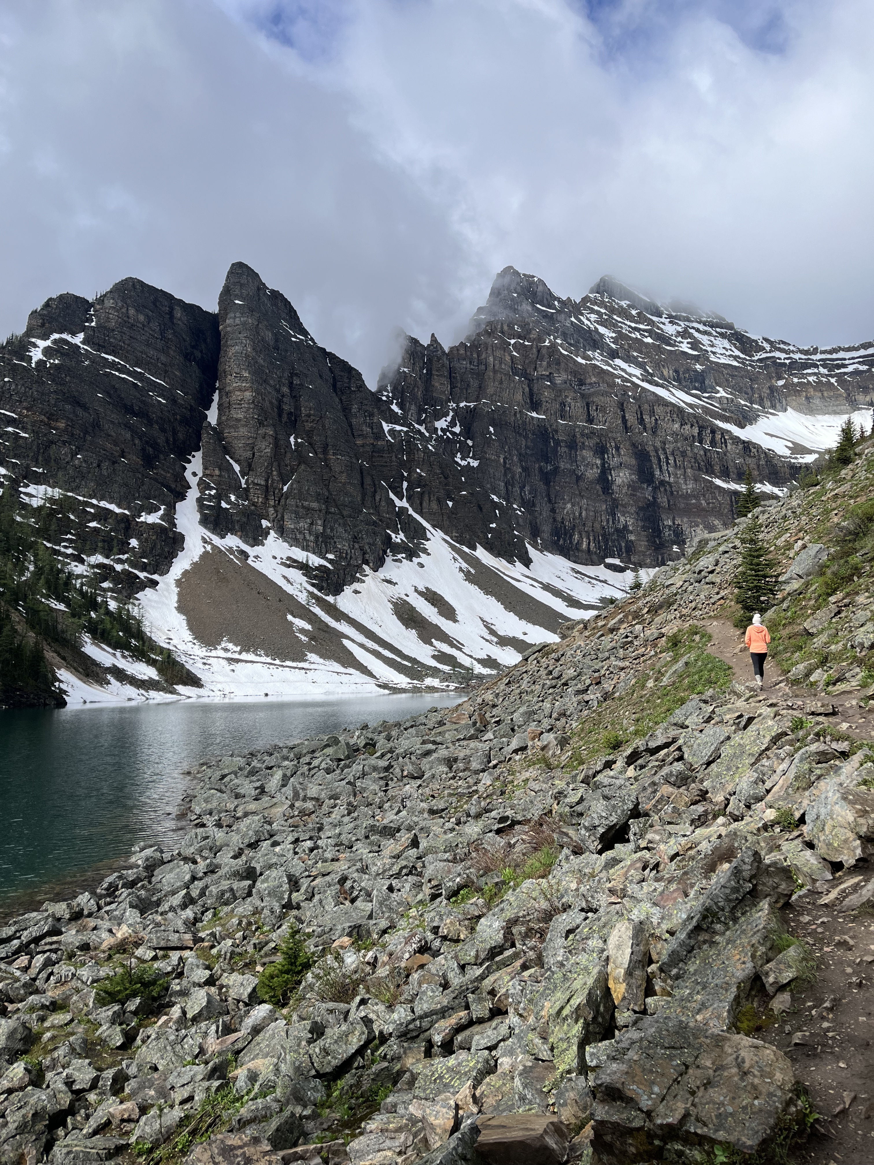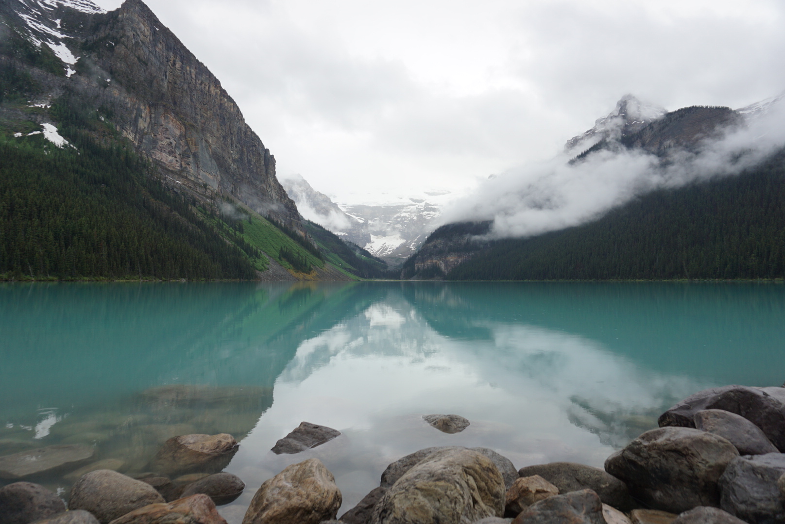 We had pretty much given up hope but when we woke up at Mosquito Creek and we realized we were only a 20-minute drive to Lake Louise. So far, it seemed like most people were late-risers and it was lightly raining so we thought, “Why not give it a shot?” And by some miracle we got in!