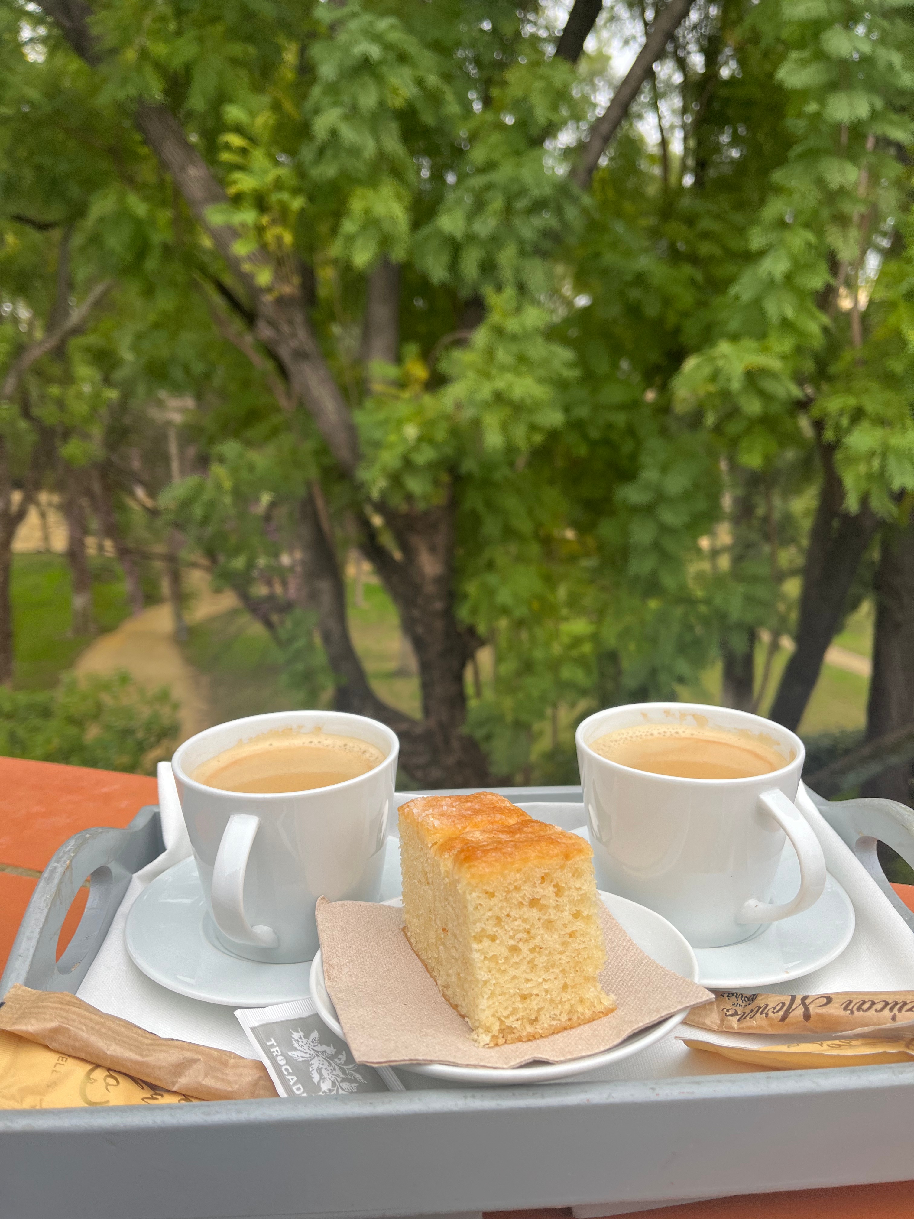 We stayed at Legado Alcazar Hotel in a terrace room with views of the Real Alcazar gardens. The gardens have peacocks, and it was nice to enjoy our coffees on the terrace.
